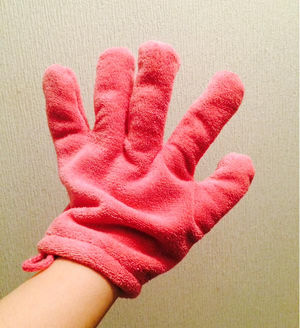 けっこう厚手の手袋で、裏返すとこのように裏面もタオル地になってます。手首部分はスポッと脱げにくいようにぐるっとゴムが入っていますよ。これを使ってドライヤーを使うと、手が熱くなることもないし早く乾くので、なかなかいい感じです。